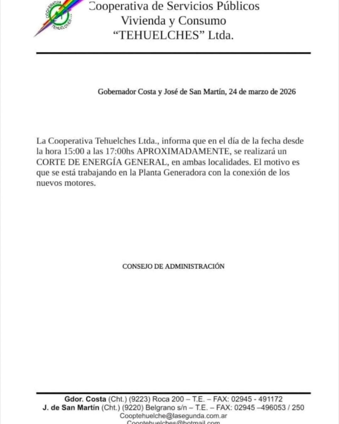 La Cooperativa Tehuelches Ltda. informa que hoy, de 15:00 a 17:00 hs aproximadamente, habrá un corte general de energía en Gobernador Costa y José de San Martín por trabajos en la planta generadora.