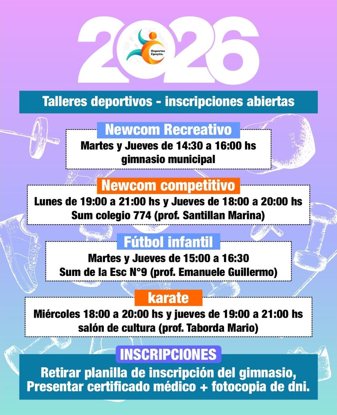 🔸La Dirección de Deportes de la Municipalidad de Epuyén anuncia la apertura de inscripciones para los talleres deportivos 2026.