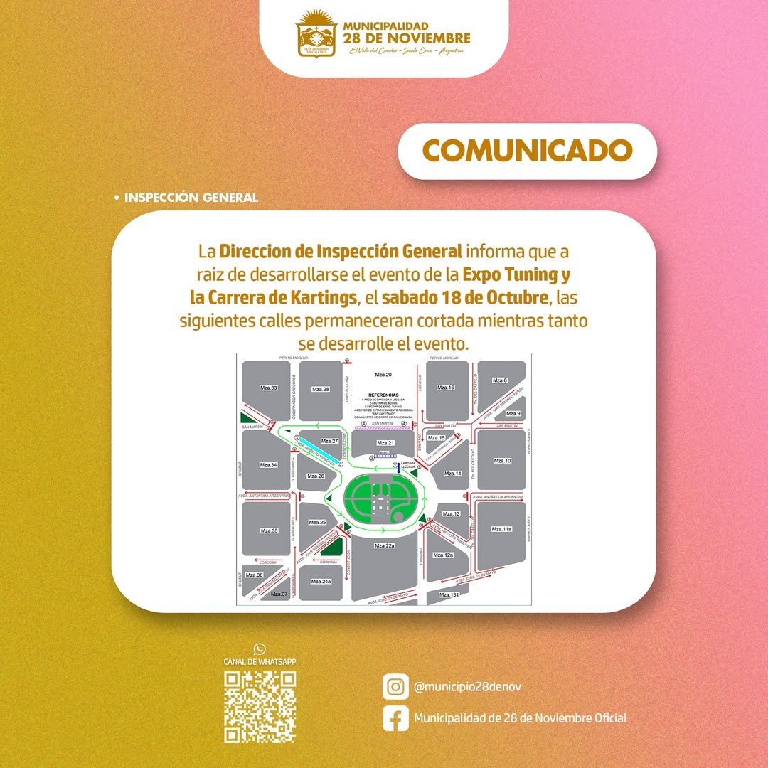 La Dirección de Inspección General informa que a raíz de desarrollarse el evento de la Expo Tuning y la Carrera de Kartings, el sábado 18 de Octubre, las siguientes calles permanecerán cortada mientras tanto se desarrolle el evento.