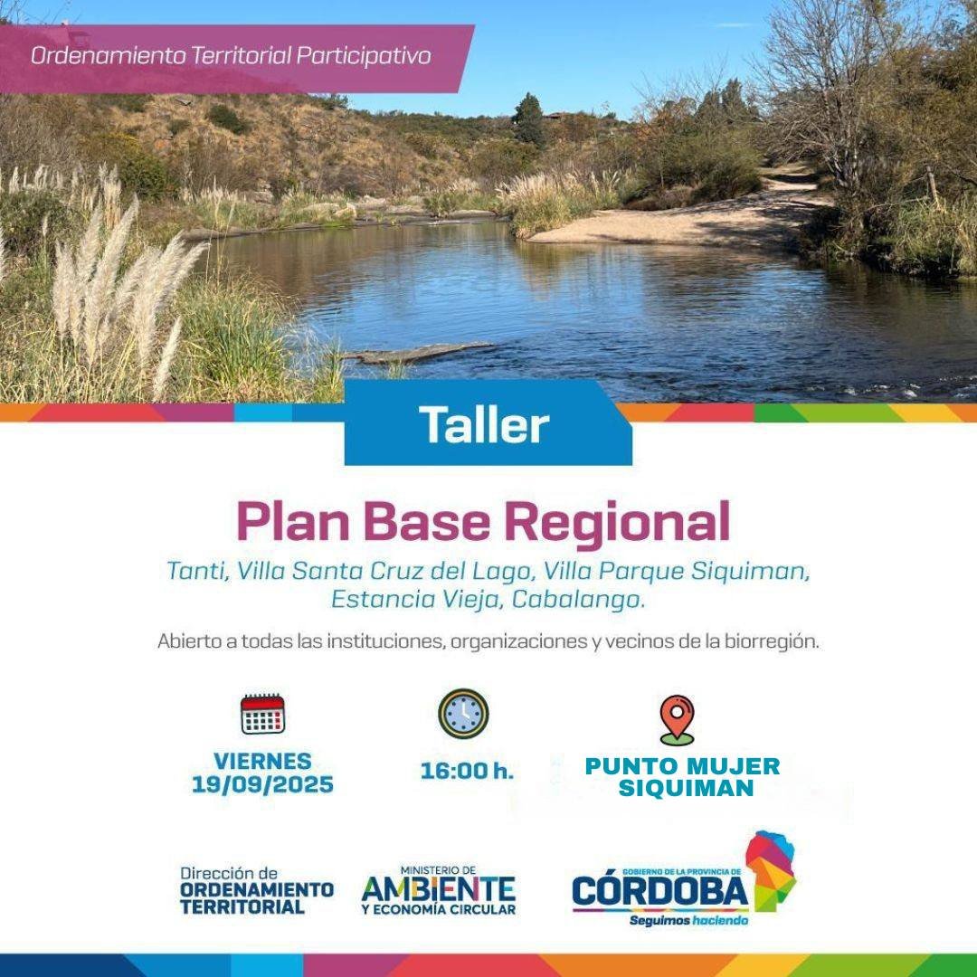 La Dirección de Ordenamiento Territorial del Ministerio de Ambiente y Economía Circular, junto a los Municipios de Tanti y Villa Santa Cruz del Lago y las Comunas de Villa Parque Siquiman, Estancia Vieja y Cabalango, invitan a todas las instituciones, organizaciones y vecinos de las cinco localidades a participar del Taller Regional Plan Base de Ordenamiento Territorial Participativo, en el marco del Programa de Ordenamiento Territorial para el Saneamiento de las Subcuencas Los Chorrillos – Las Mojarras.