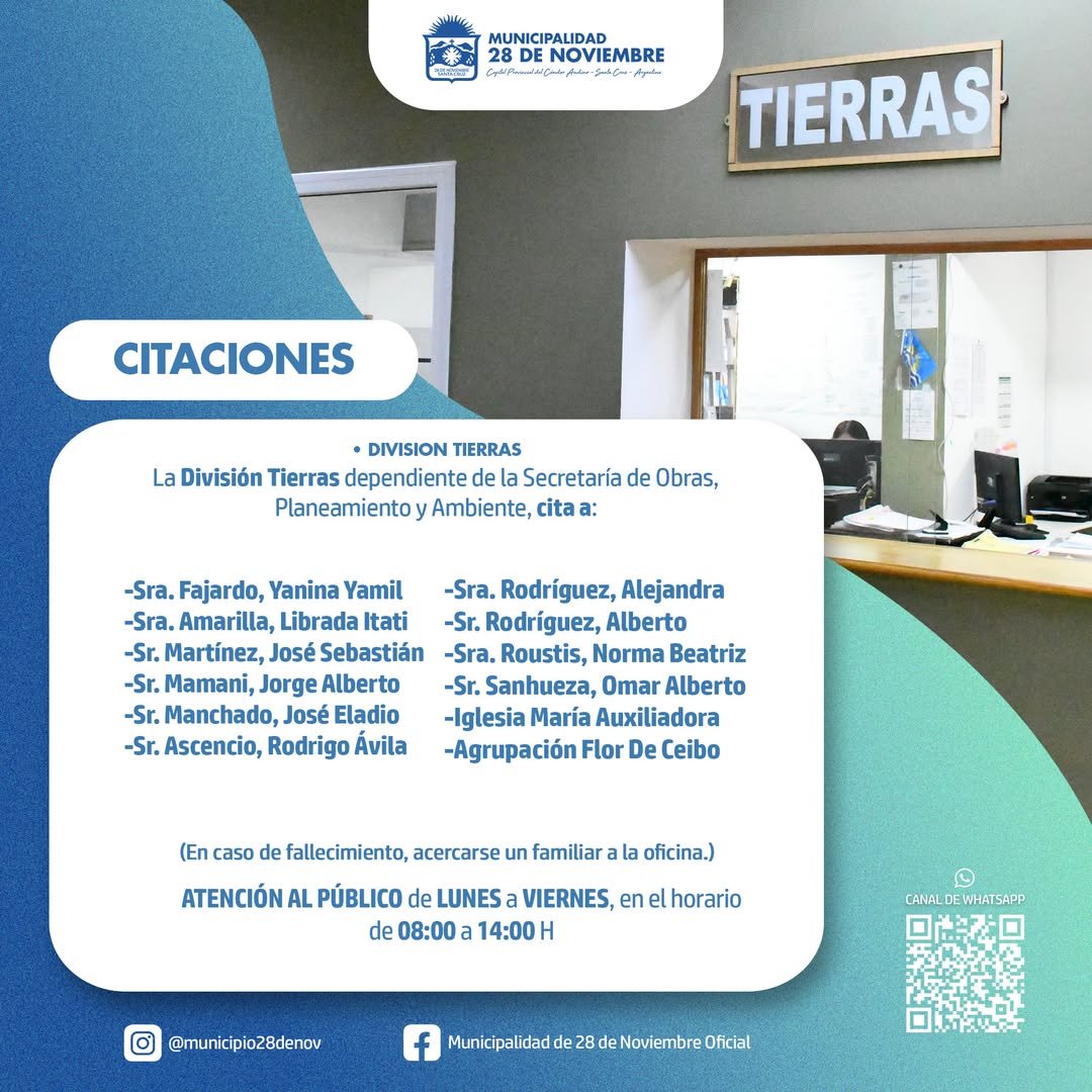 La División Tierras dependiente de la Secretaría de Obras, Planeamiento y Ambiente, cita a:…