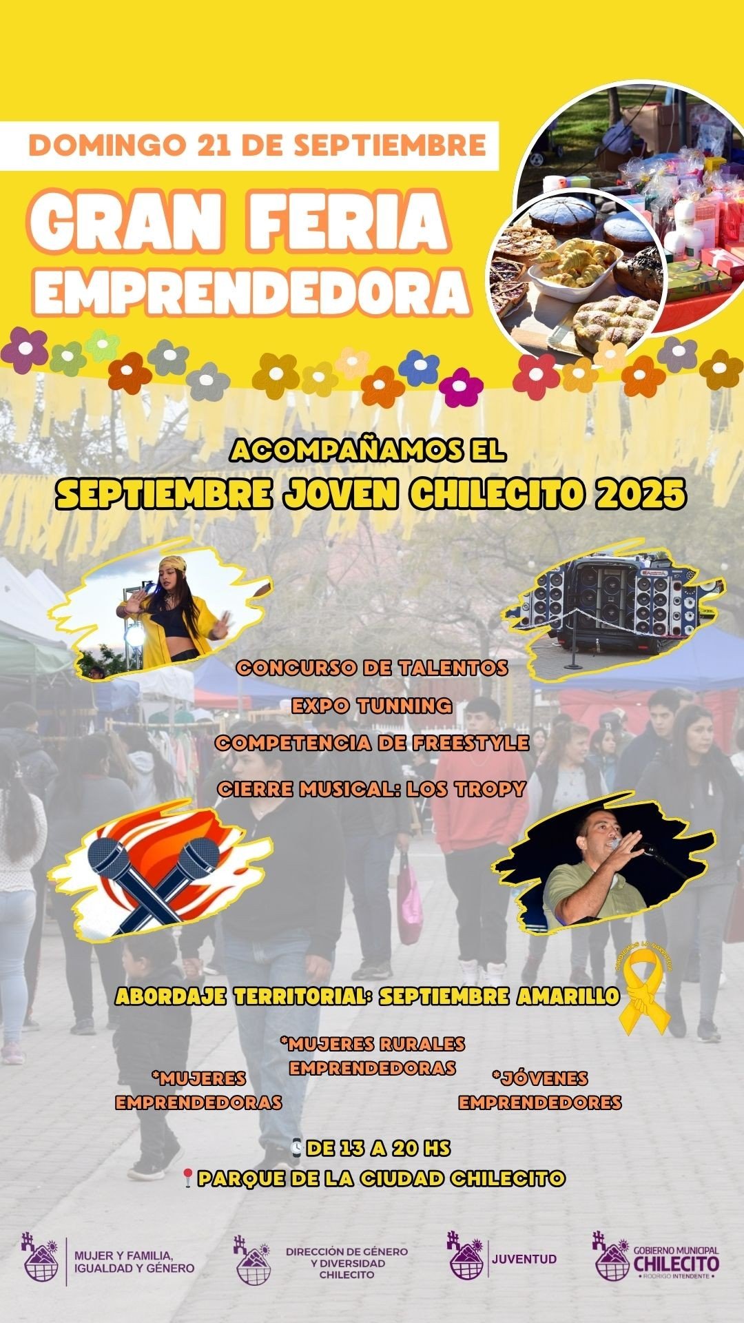 🥳 Este próximo Domingo 21 de Septiembre, acompañamos el Septiembre Joven Chilecito 2025, junto a Mujeres Emprendedoras, Mujeres Rurales Emprendedoras y Jóvenes Emprendedores.