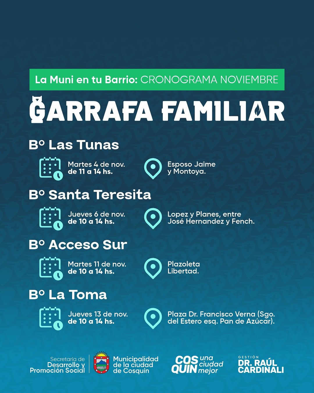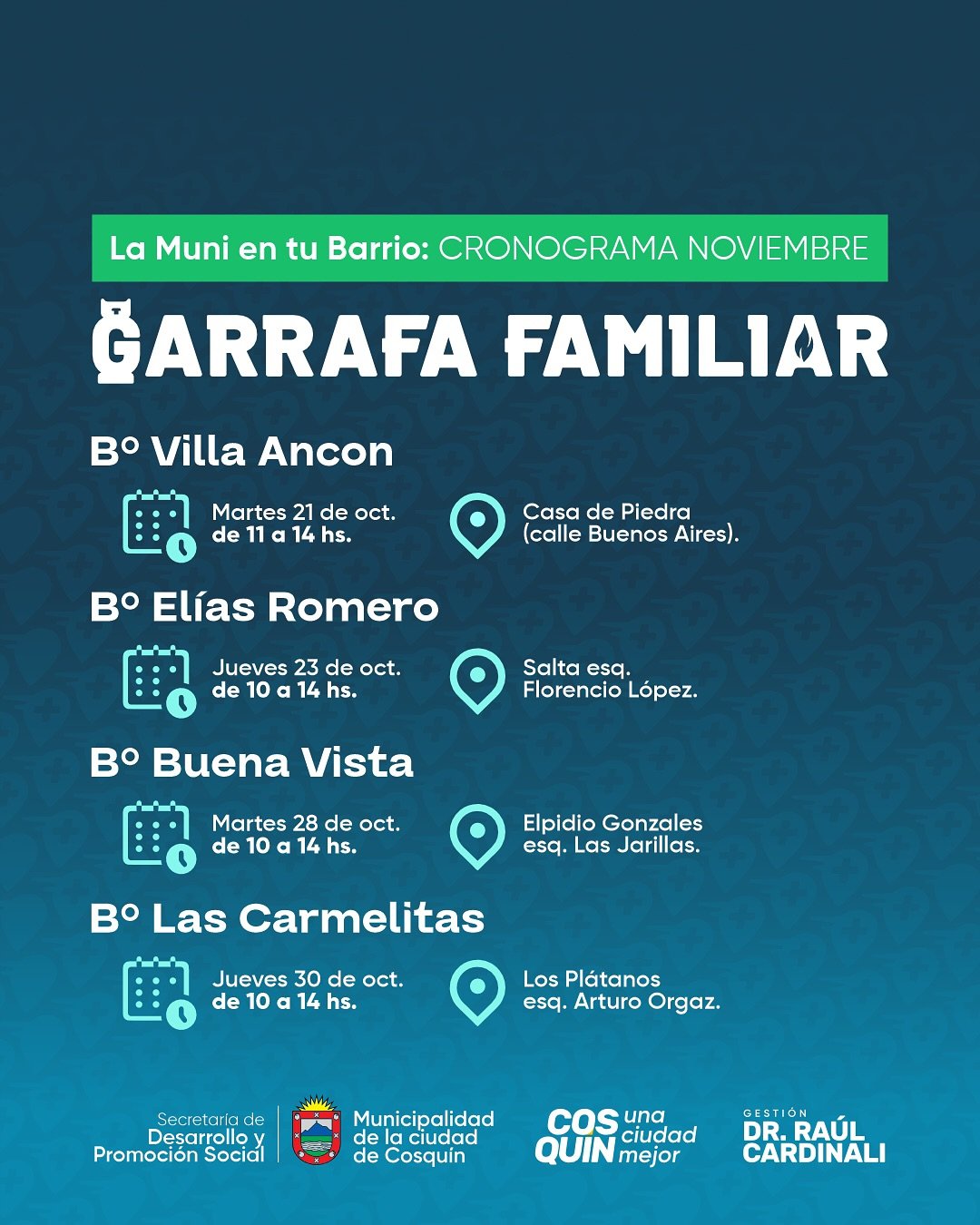 Te compartimos el cronograma de Garrafa Familiar y Salud para que puedas acercarte y recibir: