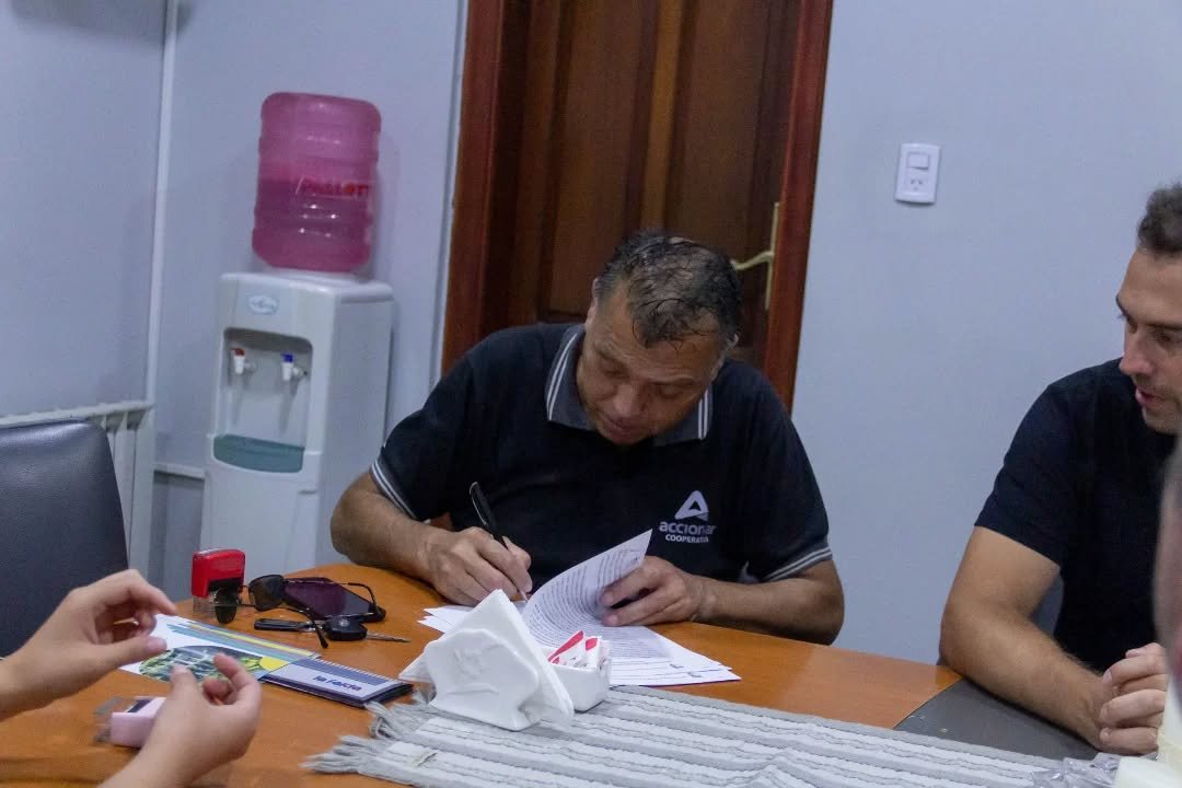 El contrato fue suscripto por el Intendente Javier Dieminger, junto al Presidente de la Cooperativa de Agua Potable ACCIONAR, Edgar Félix Madrid, y su Secretaria Florencia Yamila Mendieta.
