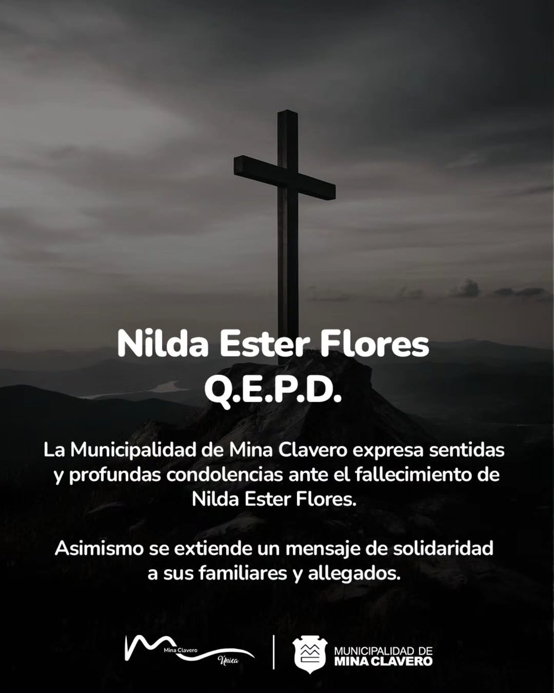 La Municipalidad de Mina Clavero expresa sus más sentidas y profundas condolencias por el fallecimiento de Nilda Ester Flores.