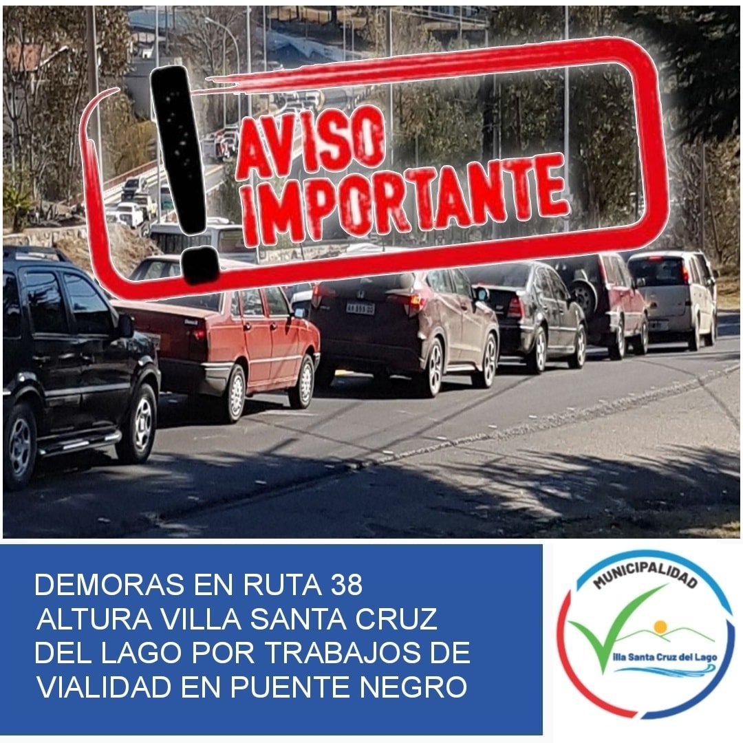 La Municipalidad de Villa Santa Cruz del Lago informa que se registran demoras en la circulación sobre la Ruta Nacional 38, a la altura del Puente Negro, debido a trabajos que realiza personal de Vialidad Nacional.
