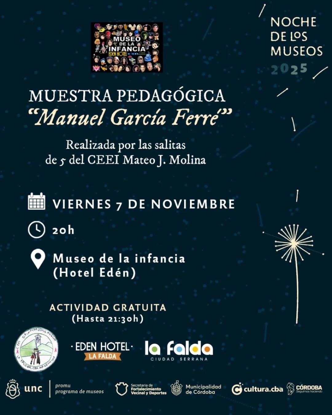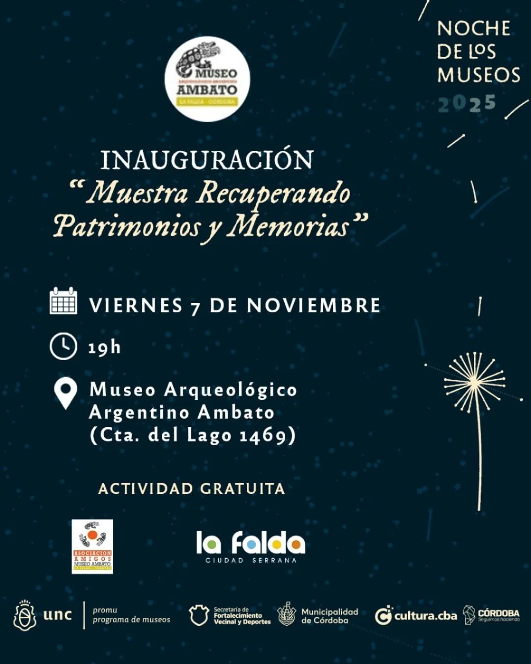 La Municipalidad de La Falda a través de la Dirección de Cultura y Educación tiene el agrado de invitarlos a disfrutar de la Noche de los Museos en nuestra Ciudad el día Viernes 7 de Noviembre. 🎨🎶