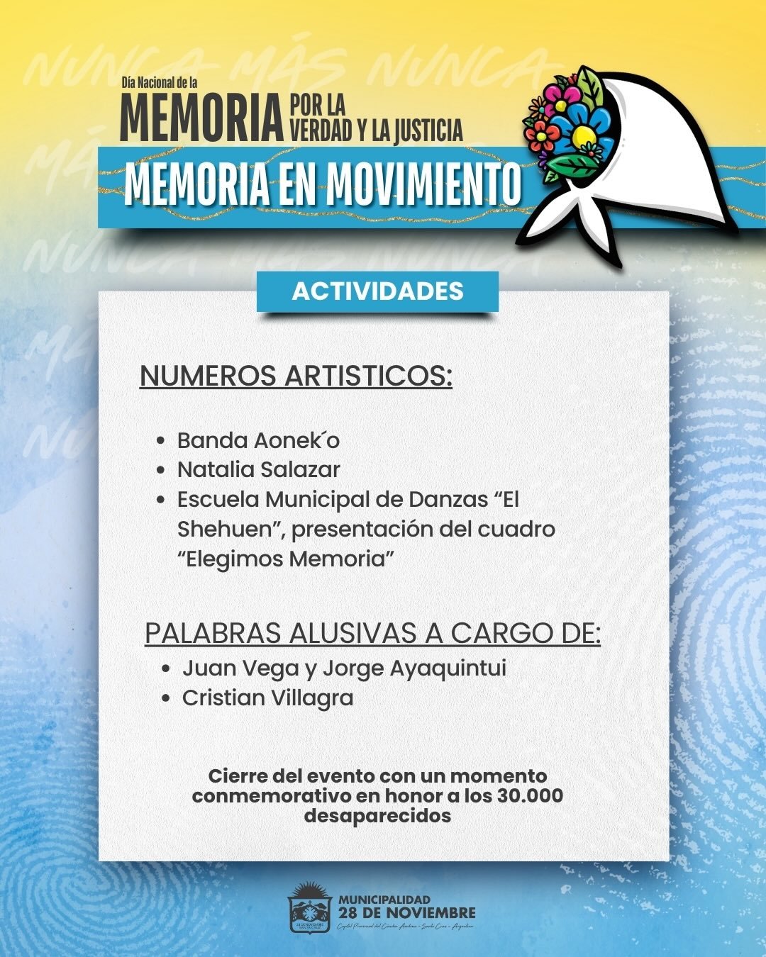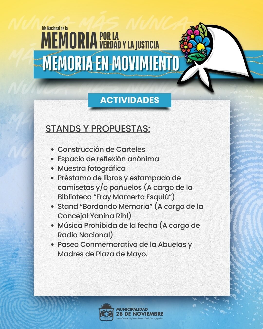 Este martes 24 de marzo, nos encontramos para reflexionar y mantener viva nuestra historia. La Municipalidad de 28 de Noviembre invita a toda la comunidad a participar de una jornada de actividades, arte y compromiso compartido.