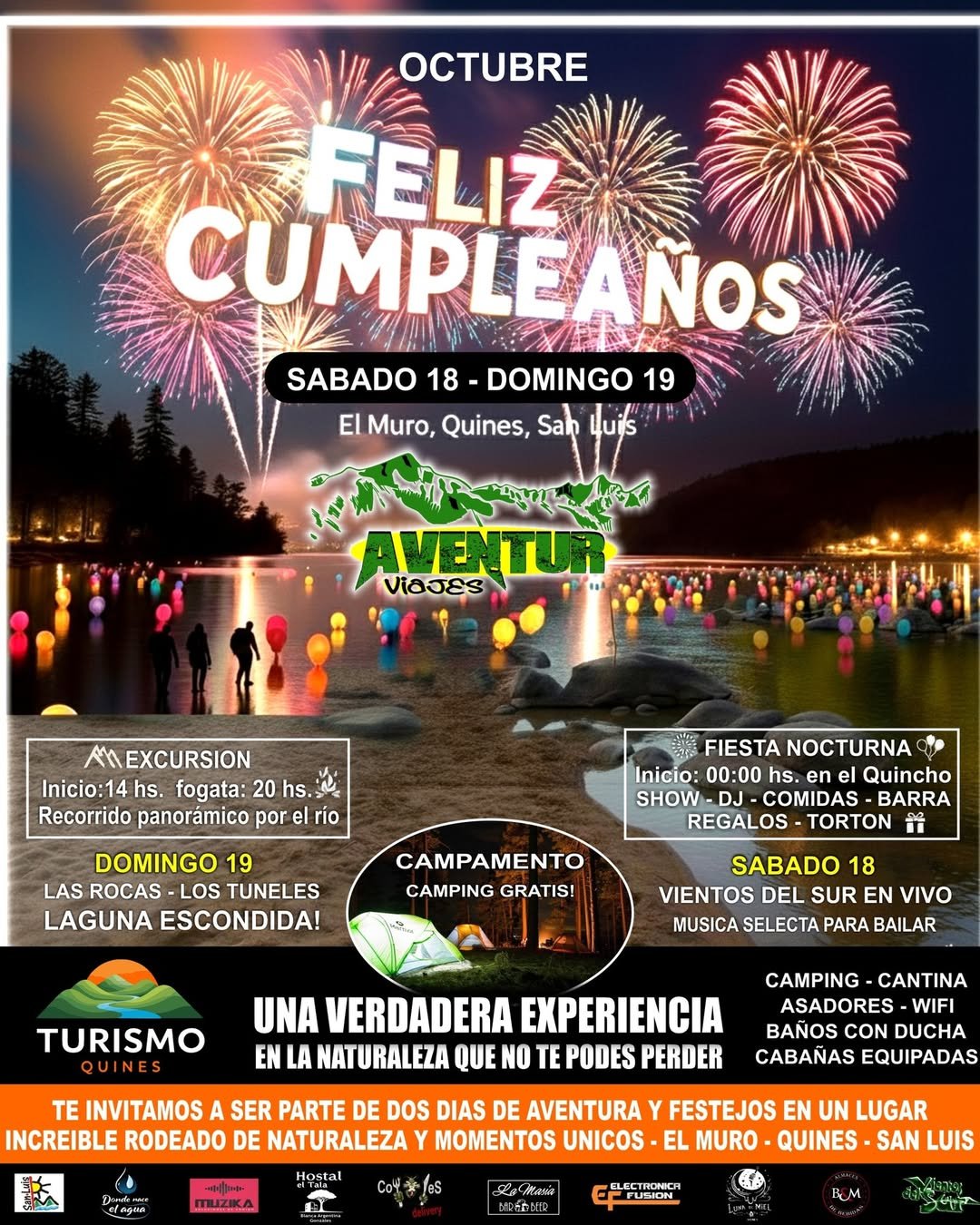 Momentos que no se vuelven a repetir.. daleeeeee aventur cumple años y te invita a esta experiencia de 2 días de festejos y aventura! visitaremos la laguna escondida – fogón y música en vivo con Vientos del Sur – fiesta con dj y torta para compartir en el Quincho del muro – cantina con comidas y Barra de tragos – cupos limitados! mas info al 2615636639 Pablo Castro