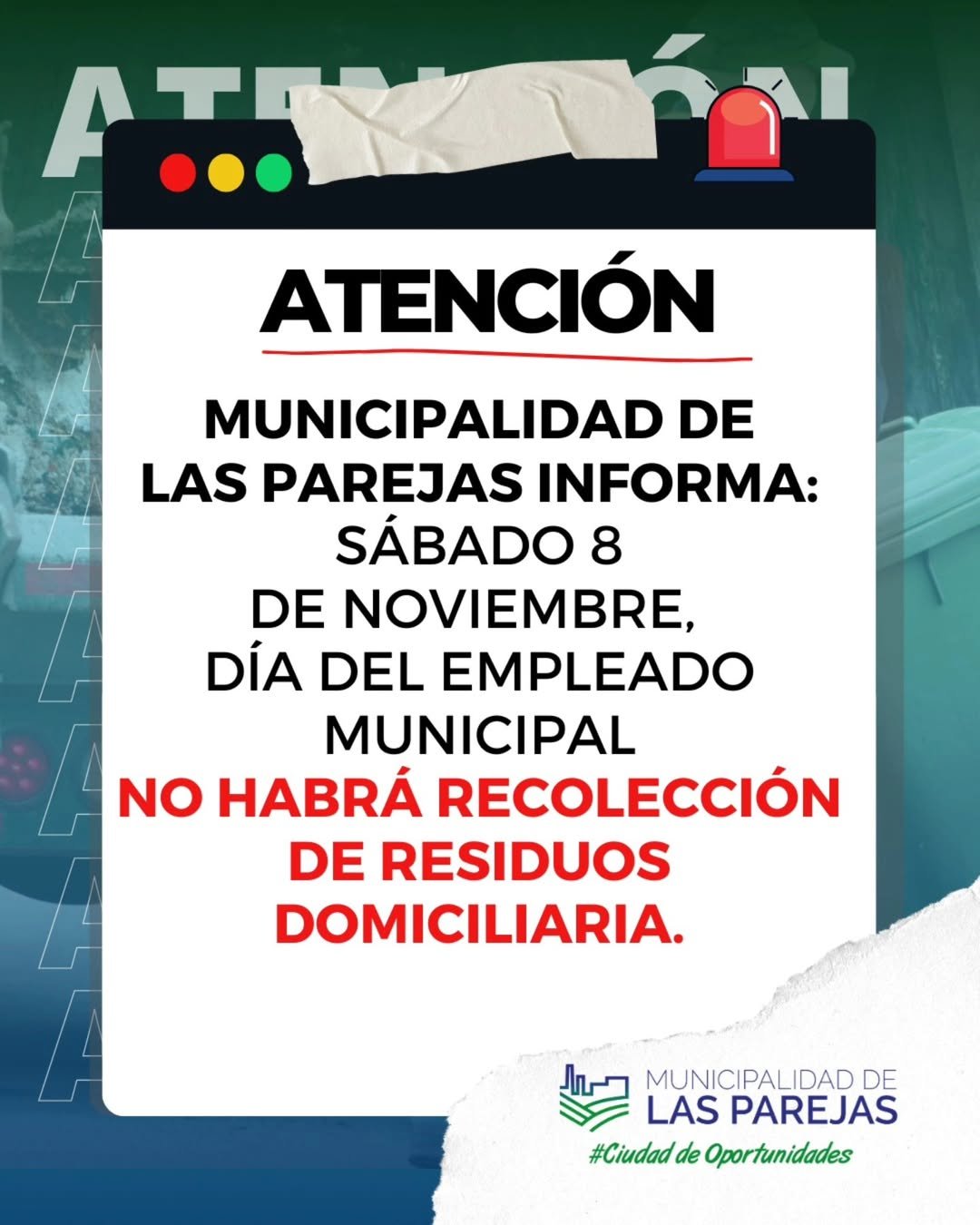 Sábado 8 de noviembre, día del empleado municipal, NO HABRÁ RECOLECCIÓN DE RESIDUOS DOMICILIARIA.