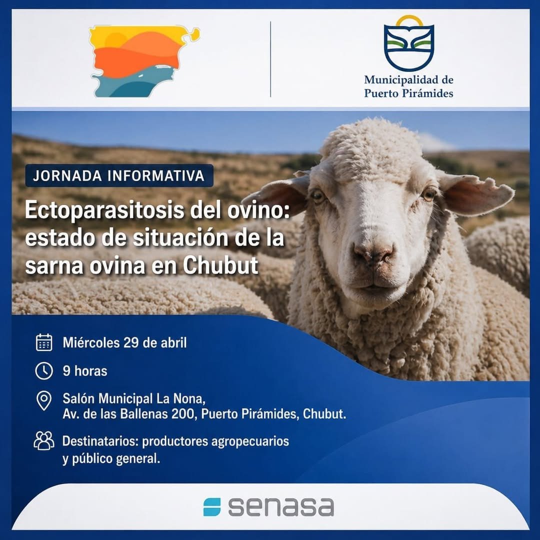 📌 La Municipalidad de Puerto Pirámides informa la realización de una importante jornada informativa destinada a productores agropecuarios y público en general, enfocada en la situación actual de la ectoparasitosis del ovino, con especial abordaje en la sarna ovina en la provincia del Chubut.