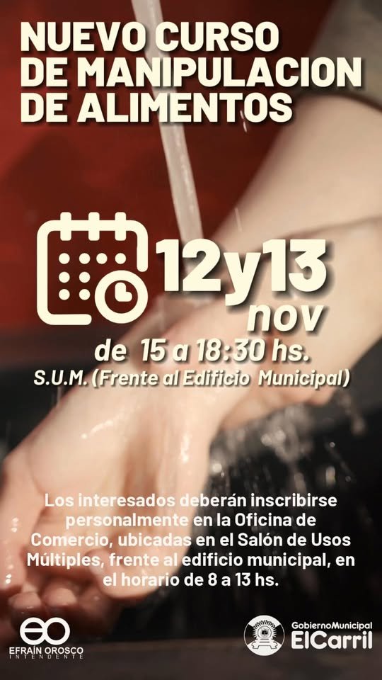 – El Gobierno Municipal de El Carril informa que los días *miércoles 12 y jueves 13 de noviembre, de 15:00 a 18:30 horas,* se realizará un nuevo *Curso de Manipulación de Alimentos en el Salón de Usos Múltiples* (frente al Edificio Municipal).
