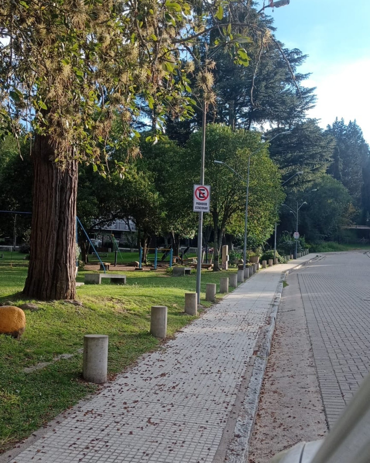 El área de Inspección General informa que se han reinstalado los carteles en el sector de Plaza Biela, indicando la prohibición de estacionar sobre el lado izquierdo.