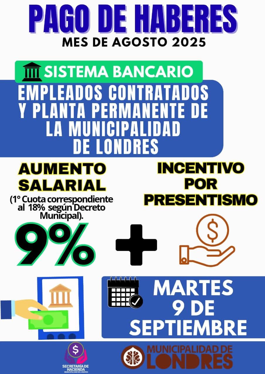 La Municipalidad de Londres informa que este martes 9 de septiembre se acreditarán, por sistema bancario, los haberes correspondientes al mes de agosto para empleados contratados y de planta permanente.