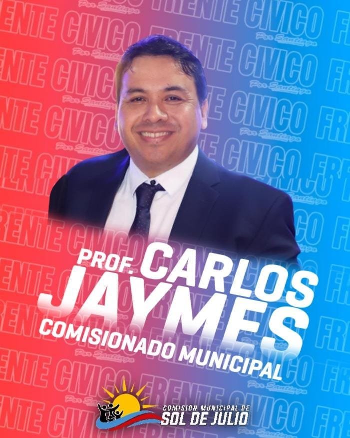 ➡️ Para seguir trabajando juntos por el progreso y el futuro de nuestro #SolDeJulio, este 26 de octubre acompañá con tu voto a nuestro candidato a Comisionado Municipal Prof. Carlos Jaymes, junto a los candidatos del Frente Cívico por Santiago 👍🗳️