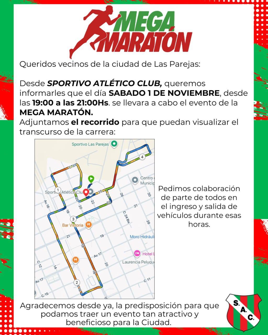 Desde SPORTIVO ATLĂTICO CLUBâ€ïžđ, queremos informarles que el dĂa SABADO 1 DE NOVIEMBRE, desde las 19:00 a las 21Hs. se llevara a cabo la MEGA MARATĂN.