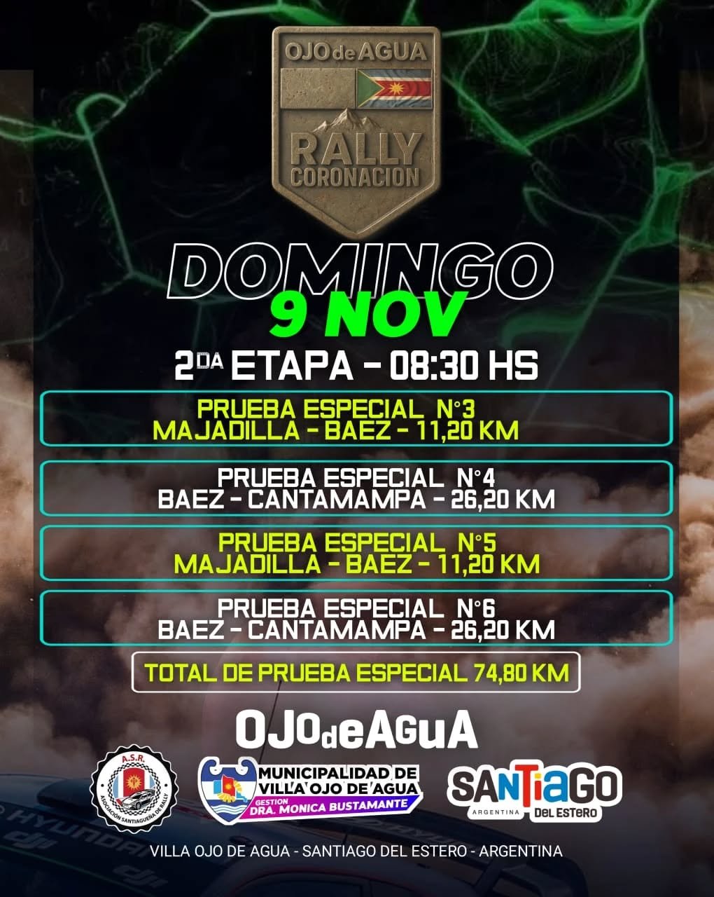 👉 Domingo 9: 2° Etapa, comenzando a las 8:30 hs con las siguientes pruebas especiales: N° 3 Majadilla – Báez; N° 4 Báez – Cantamampa; N° 5 Majadilla – Báez, y N° 6 Báez – Cantamampa.