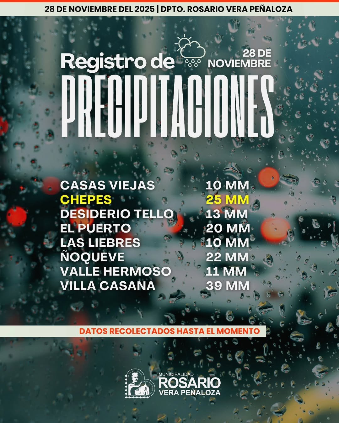 El Gobierno Municipal, a través de la Secretaría del Interior, informa el registro de precipitaciones correspondientes a la noche de ayer, 28 de noviembre, y a la madrugada de hoy, 29 de noviembre, en todo el departamento Rosario Vera Peñaloza.