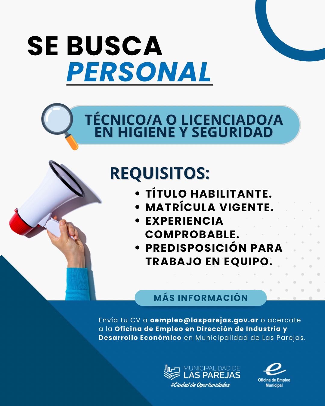 🔎 SE BUSCA PERSONAL: TÉCNICO/A O LICENCIADO/A EN HIGIENEN Y SEGURIDAD.