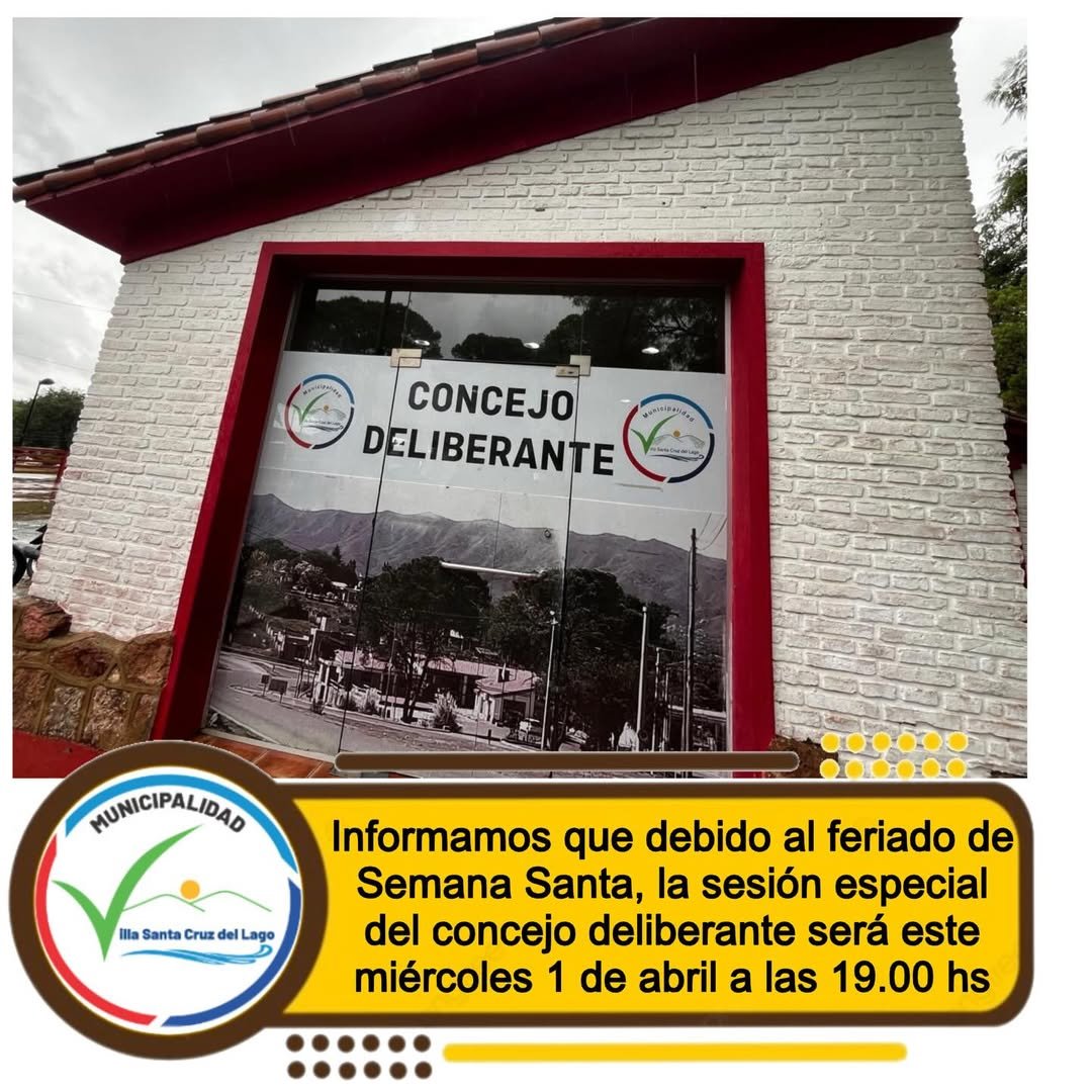 Se informa que debido al feriado de semana santa el dia miércoles 1 de abril a las 19.00 hs se llevara a cabo la Sesion Especial en la que se tratara el siguiente orden del día: