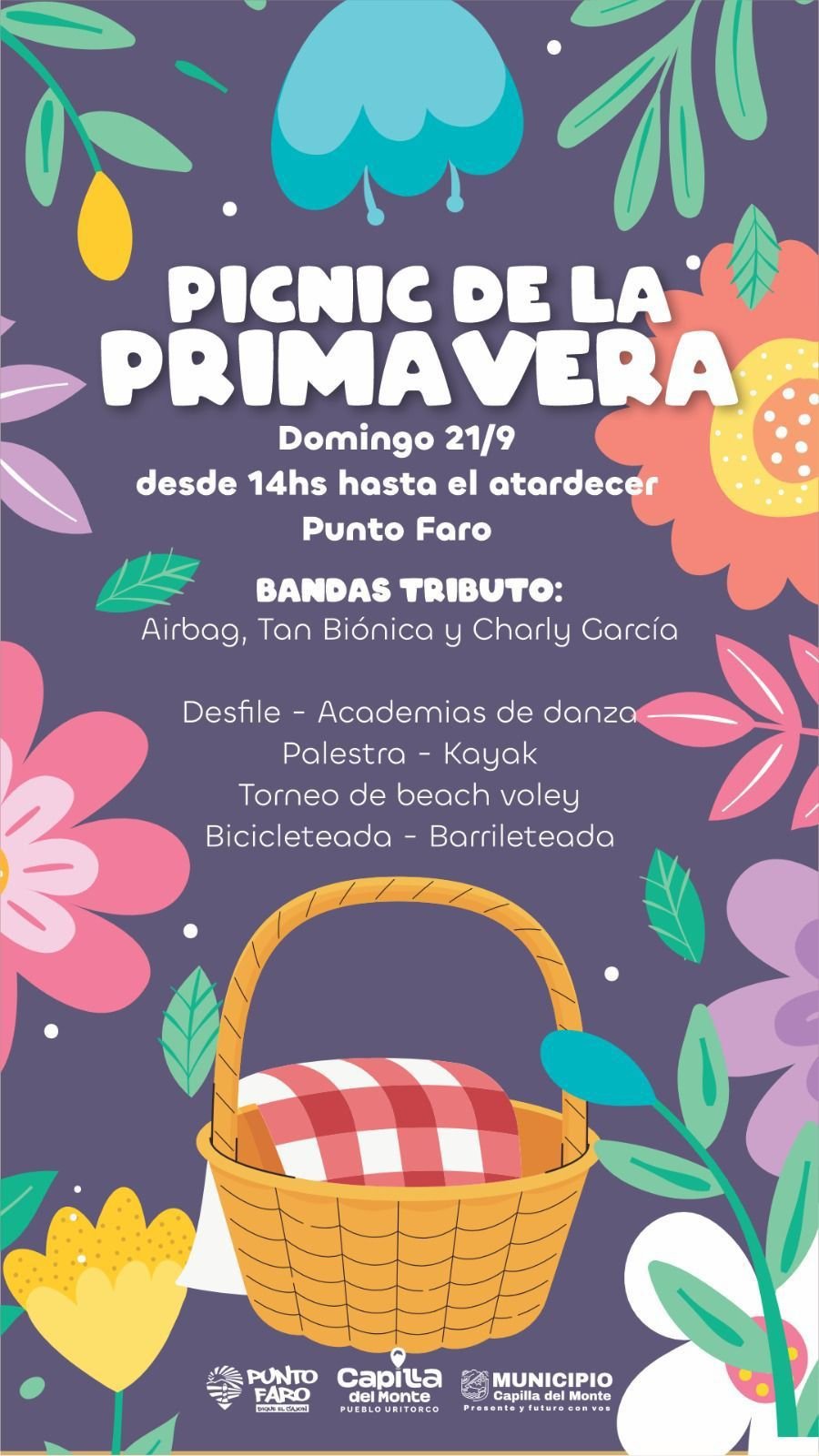 🌸 ¡Se viene la primavera a Capilla del Monte! Este domingo 21/9 desde las 14 hs te esperamos en Punto Faro para compartir una tarde llena de música, diversión y alegría. Habrá bandas tributo a Airbag, Tan Biónica y Charly García, además de shows de academias de danza, desfile y muchas actividades.