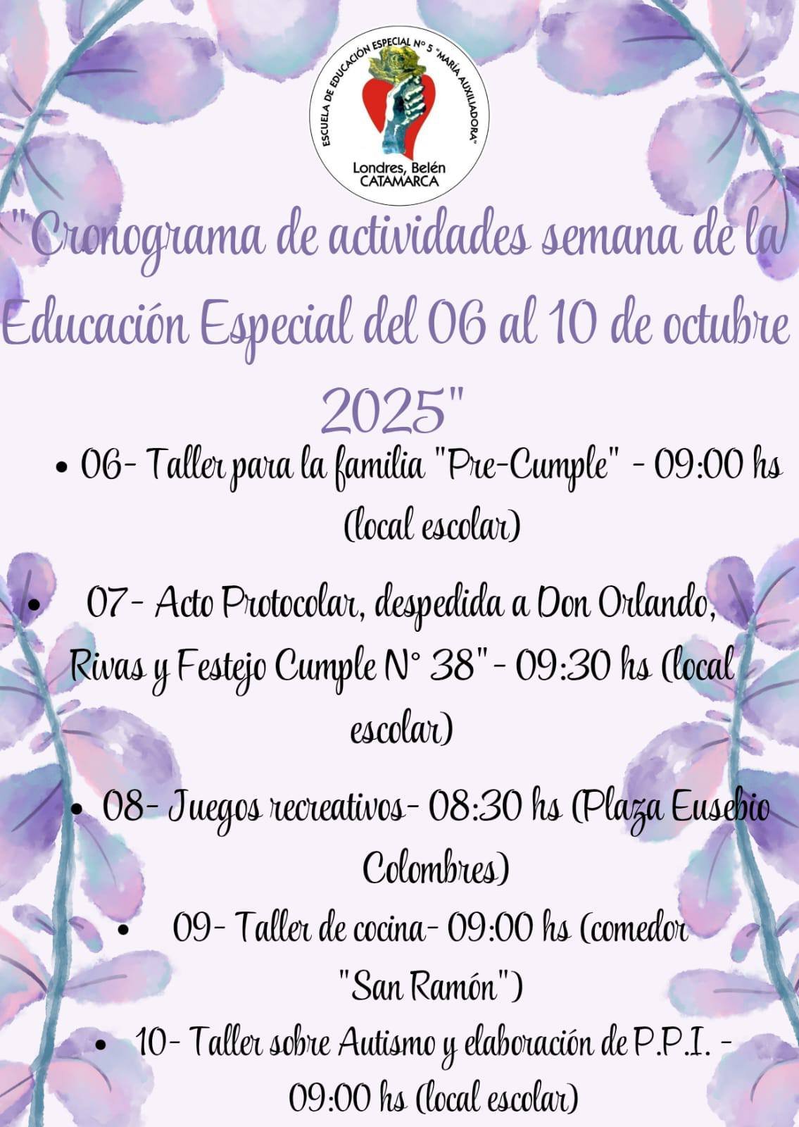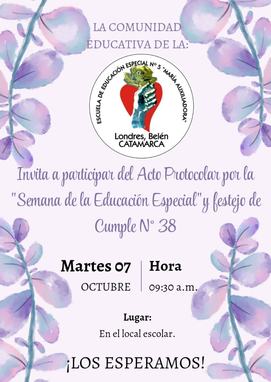 La Escuela de Educación Especial N° 5 “María Auxiliadora” invita a toda la comunidad a ser parte de la Semana de la Educación Especial, que se desarrollará del 06 al 10 de octubre en nuestra localidad.