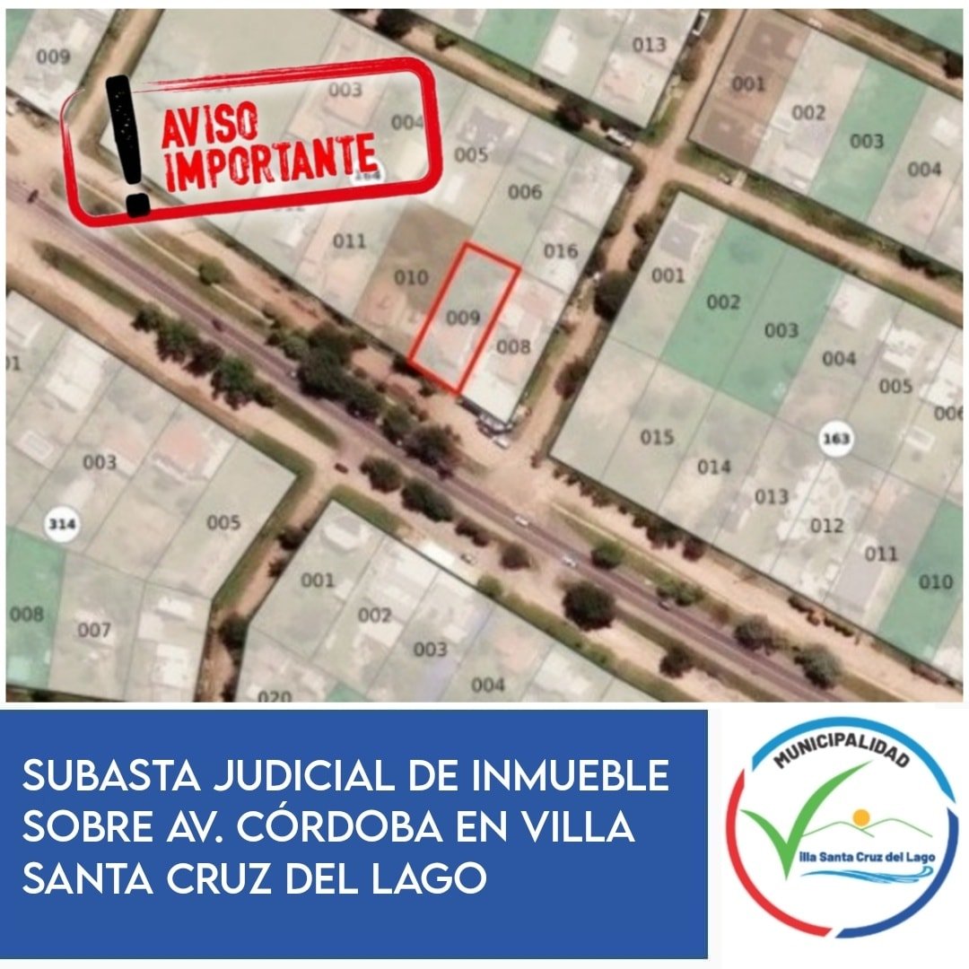 La Municipalidad de Villa Santa Cruz del Lago informa a la comunidad que el Poder Judicial de la Provincia de Córdoba llevará adelante la subasta electrónica judicial de un inmueble ubicado en nuestra localidad, Departamento Punilla, a través del Portal de Subastas Judiciales Electrónicas.