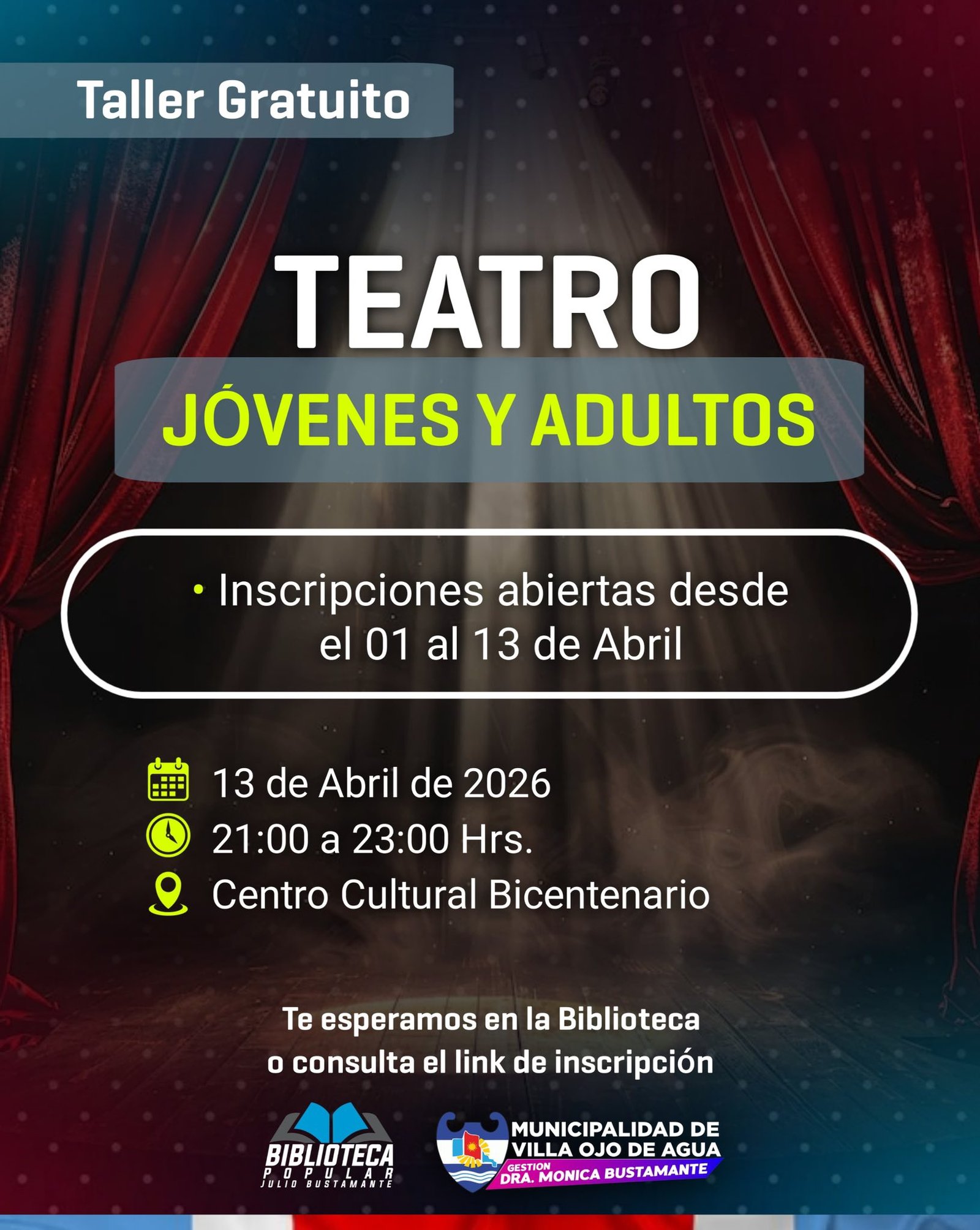 ✅ Desde la Municipalidad de Villa Ojo de Agua, apostamos por un nuevo taller para desarrollar nuestras habilidades de transmitir emociones y contar historias a través del arte: el teatro es su máxima expresión.