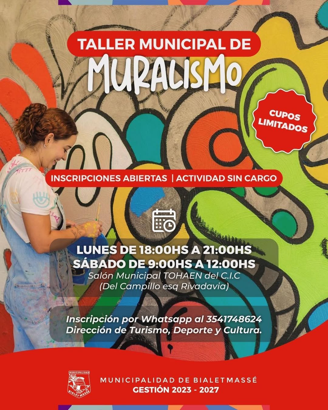 La Municipalidad de Bialet Massé abre las inscripciones al Taller Municipal de Muralismo, una actividad gratuita pensada para aprender técnicas, desarrollar la creatividad y aportar color a nuestros espacios.