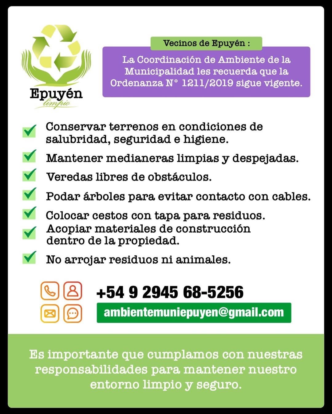 ⚠️♻️👉 Citaciones de la Coordinación de Ambiente. 🔸 La Coordinación de Ambiente de la Municipalidad de Epuyén cita a las siguientes personas, por motivos que a su presentación se les dará a conocer. 📌 Horarios y Contacto. • Horarios de atención: Lunes a viernes de 9 a 13 hs. • Teléfono: +54 9 2945 685256 … Leer más