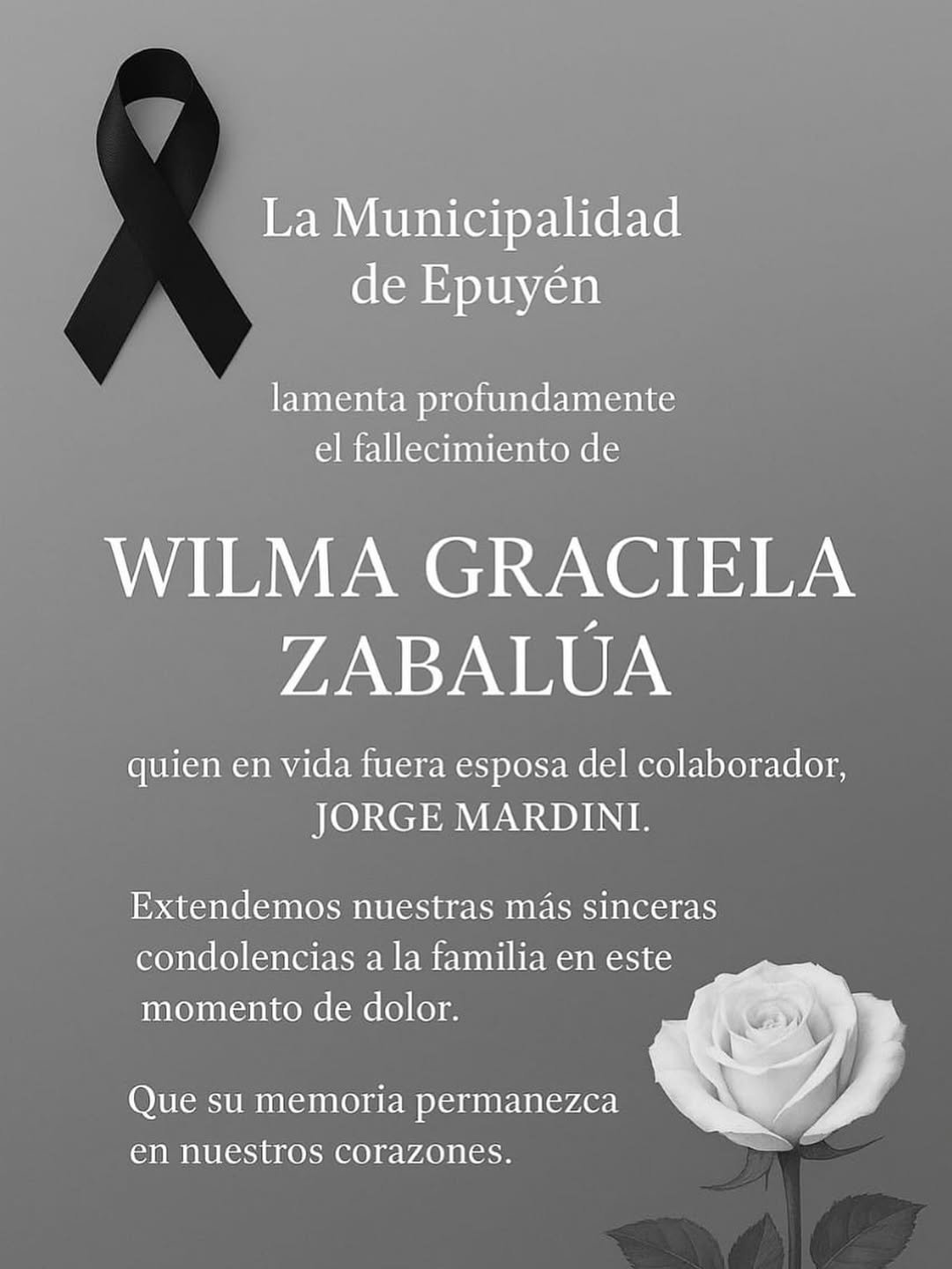 La Municipalidad de Epuyén lamenta profundamente el fallecimiento de Wilma Graciela Zabalúa, compañera de vida de nuestro querido colaborad…