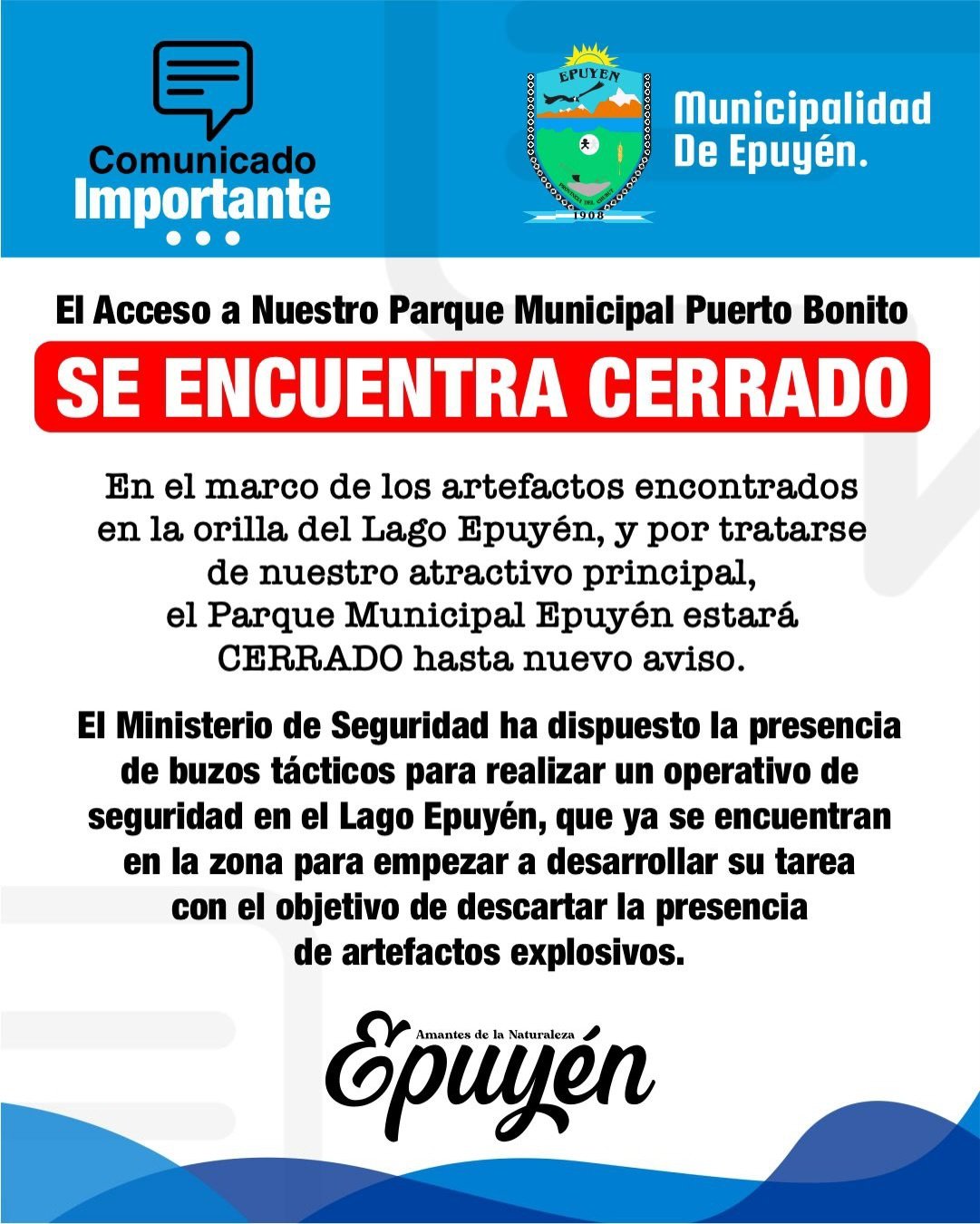 En una entrevista realizada por nuestro medio, el intendente de Epuyén, Sr. José Contreras, brindó detalles sobre el rastrillaje que se está llevando adelante en el Parque Municipal Puerto Bonito, a raíz de las reiteradas apariciones de material explosivo en el sector. El jefe comunal explicó que estas tareas preventivas se están desarrollando con el … Leer más