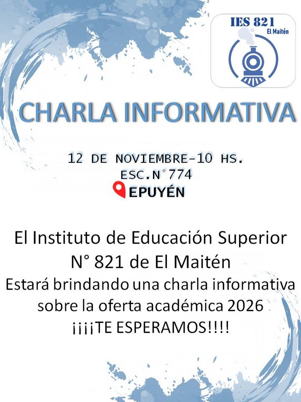 📚 Atención comunidad de Epuyén. 🔸 El Instituto de Educación Superior N° 821 de El Maitén te invita a una charla informativa sobre la Oferta Académica 2026. 📅 Fecha: 12 de noviembre ⏰ Hora: 10:00 hs 📍 Lugar: Escuela N° 774 (Epuyén) ✨ ¡No te pierdas la oportunidad de conocer las carreras y propuestas educativas … Leer más