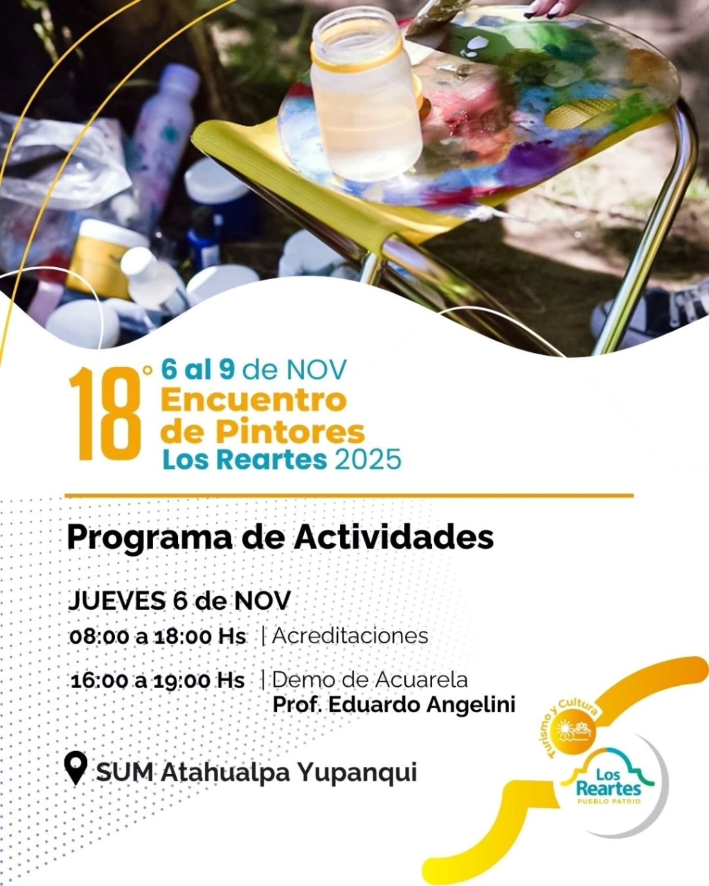 18º Encuentro de Pintores – Los Reartes Del 6 al 9 de noviembre, Los Reartes vuelve a celebrar el arte con el 18º Encuentro de Pintores, la 7ª edición de Pintores Adolescentes y la 11ª de Pintorcitos. Te invitamos a ser parte y a acompañar a nuestros artistas en cada jornada. PROGRAMA DE ACTIVIDADES JUEVES … Leer más