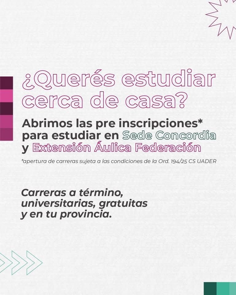 📚 Preinscripción Abierta | Ingreso 2026 ⏳ ¡Tenés tiempo hasta el 30 de septiembre para preinscribirte! 👉 Carreras de nivel superior en la Sede Concordia y en la nueva Extensión Áulica Federación de la FHAyCS – UADER. ✅ Ingreso gratuito, irrestricto y con curso de ingreso obligatorio 📍 Modalidad presencial 🖱 Preinscripción online disponible ⚠️ … Leer más