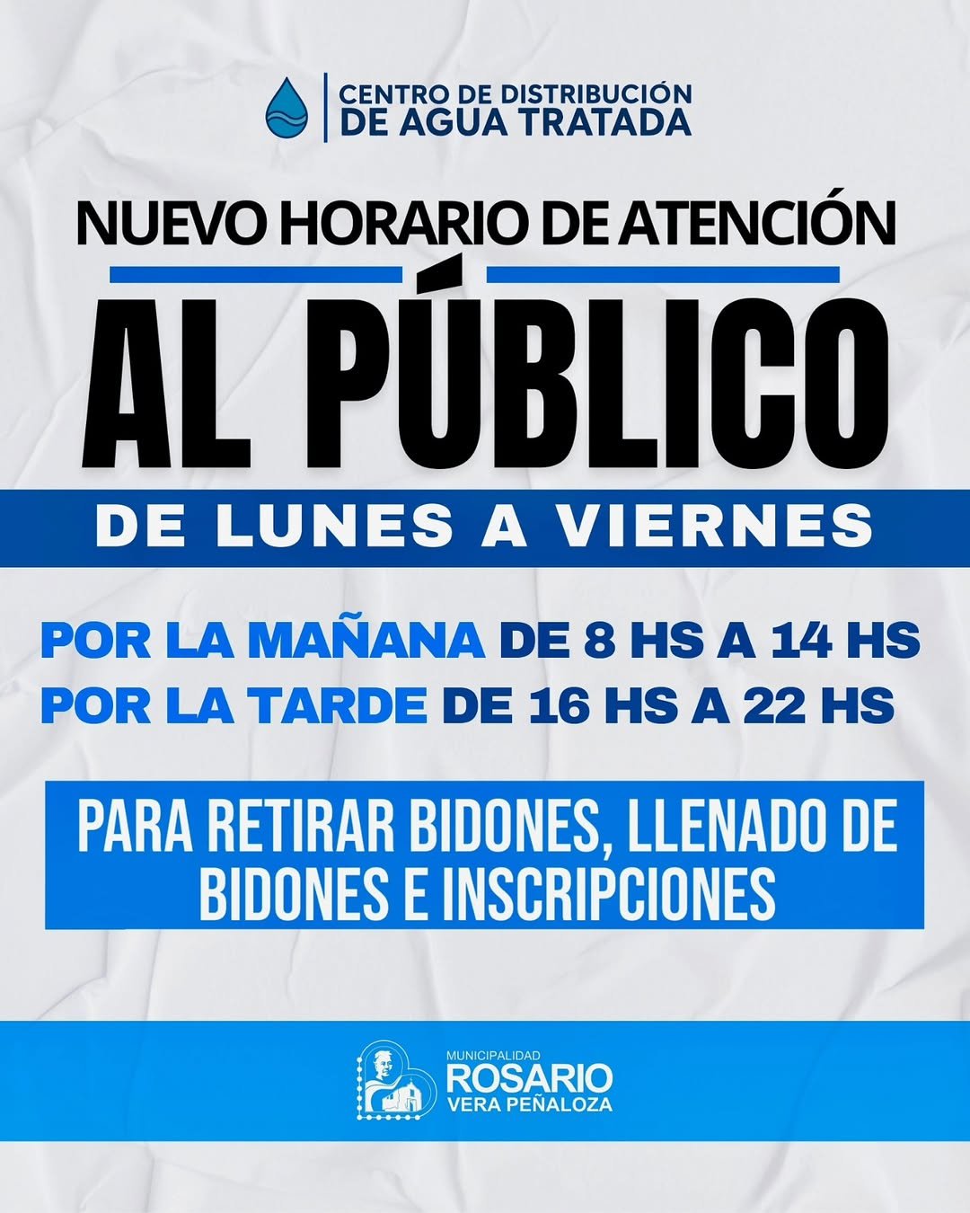 ATENCIÓN VECINOS Informamos que el -Centro de distribución de Agua Tratada- actualizó sus horarios, ampliando la atención por la tarde de 16 a 22 horas. Recordá que podés acercarte a las oficinas para el llenado y retiro de bidones y, si aún no estás inscripto, realizar allí el trámite correspondiente. ———————————————– Todos los días InfoMunicipios … Leer más