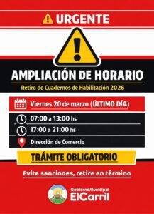 URGENTE: SE AMPLÍA EL HORARIO DE ATENCIÓN PARA EL RETIRO DE CUADERNOS DE HABILITACIÓN 2026…