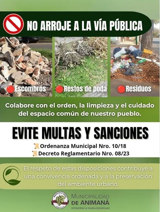 Cuidar Animaná es una responsabilidad de todos. No está permitido arrojar escombros, restos de poda ni residuos en la vía pública. Ordenanza Municipal Nro. 10/18 Decreto Reglamentario Nro. 08/23 Evitemos multas y sanciones. Con orden y compromiso, construimos un pueblo más limpio y saludable. Municipalidad de Animaná – Intendencia María Rodríguez