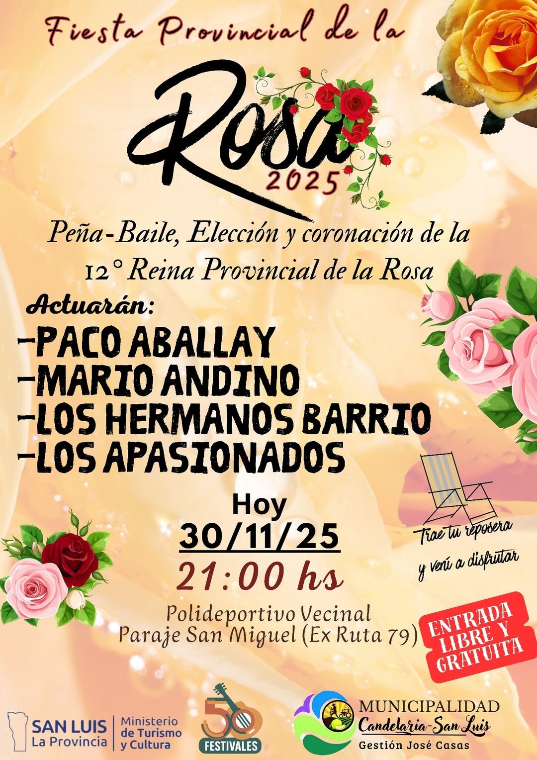 Hoy, celebramos la Fiesta Provincial de la Rosa 2025 Te invitamos a vivir una noche única con peña, baile, elección y coronación de la 12° Reina Provincial de la Rosa 🎤 Actuarán: 🎶 Paco Aballay 🎶 Mario Andino 🎶 Los Hermanos Barrio 🎶 Los Apasionados 📅 Hoy, domingo 30 de noviembre 🕘 21:00 hs 📍 … Leer más