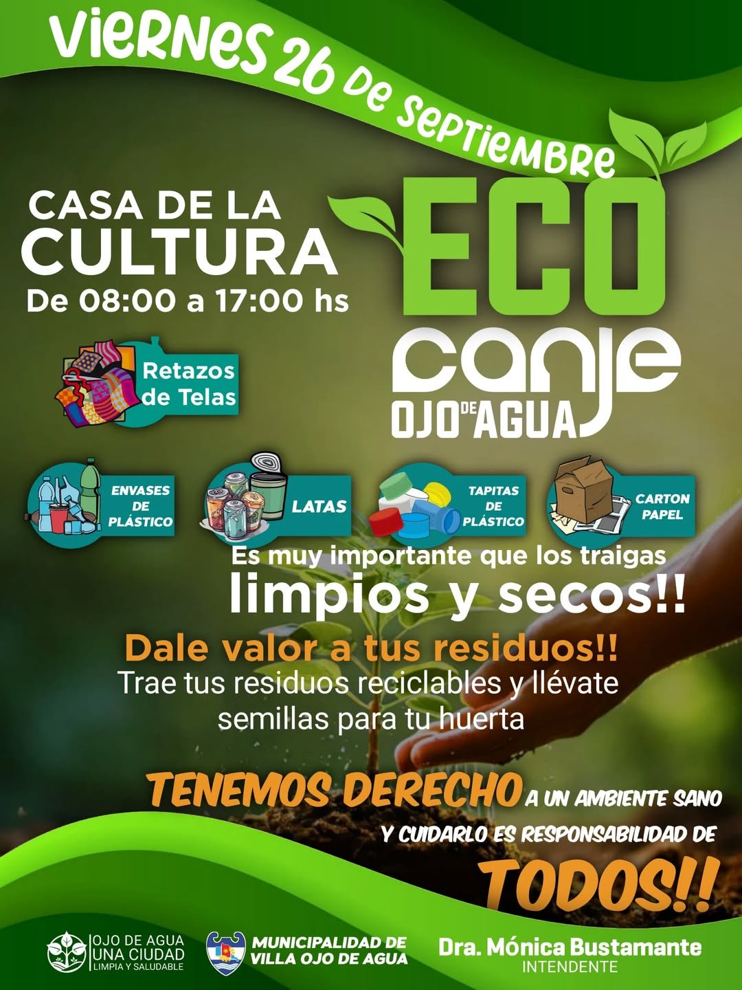 ♻️ ECOCANJE OJO DE AGUA 📣La Municipalidad de Villa Ojo de Agua invita a la comunidad a seguir participando de las jornadas de recepción y canje de residuos reciclables. 📍 Esta actividad tiene como objetivo: REDUCIR la cantidad de residuos que generamos en nuestra ciudad. REUTILIZAR y RECICLAR materiales valiosos que deshechamos cotidianamente. 🌎 En … Leer más