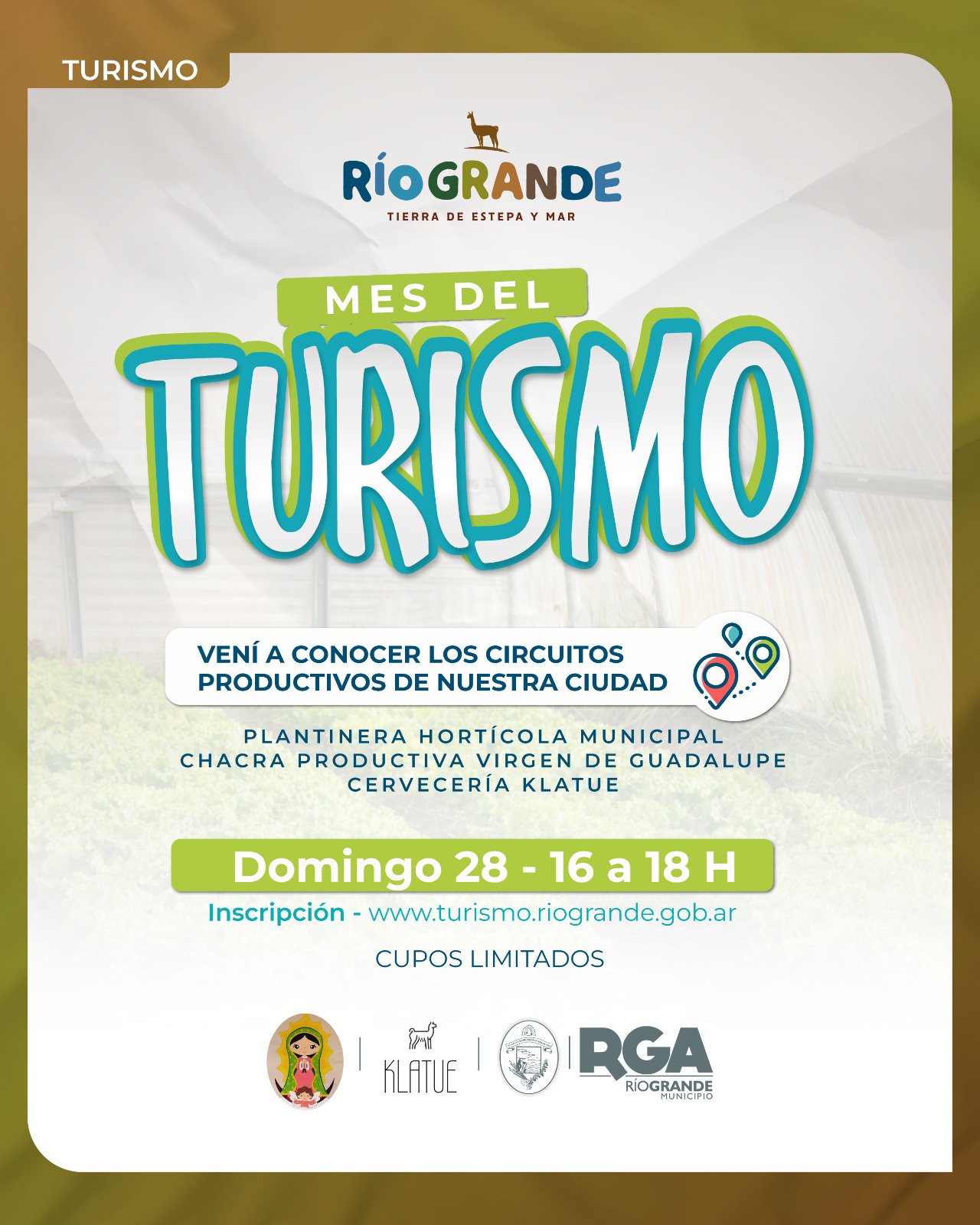 🌍✨ Río Grande celebra el Mes del Turismo Te invitamos a participar de las salidas recreativas para conocer a los productores locales de nuestra ciudad. 🕓 Todas las salidas son de 16 a 18 horas ‼️ Mayores de 12 años | Cupos limitados 📍 Inscripción en 👉 https://turismo.riogrande.gob.ar/ ✨ Sigamos celebrando el turismo local, en … Leer más