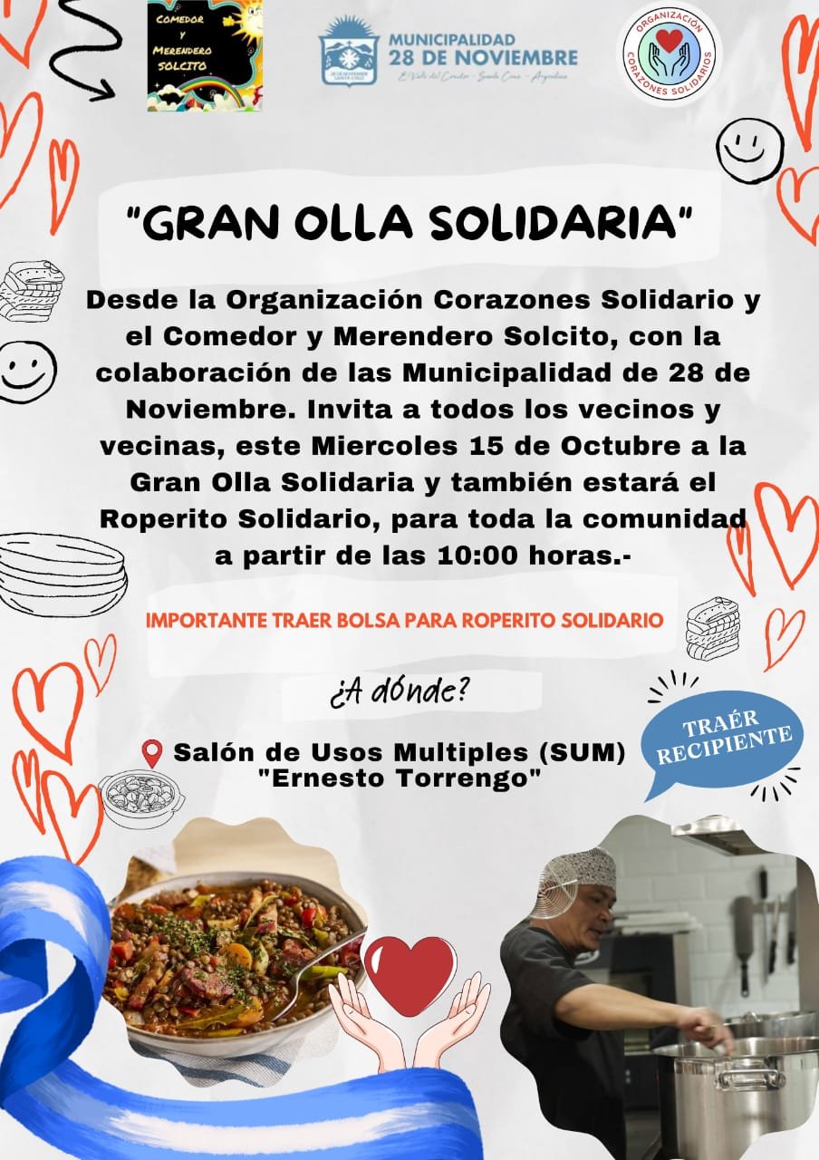 Desde la Organización Corazones Solidario y el Comedor y Merendero Solcito, con el acompañamiento de la Municipalidad de 28 de Noviembre, invitamos a todos nuestros vecinos y vecinas a participar de la Gran Olla Solidaria 🌟