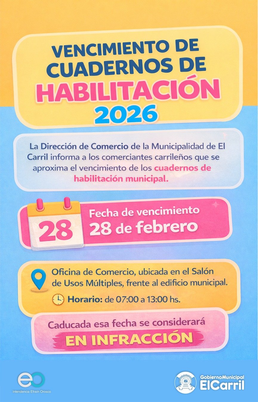 – La Dirección de Comercio de la Municipalidad de El Carril informa a los comerciantes carrileños que se aproxima el vencimiento de los cuadernos de habilitación municipal.